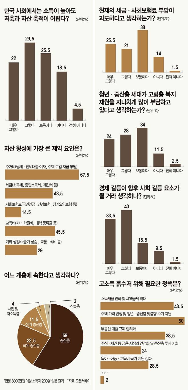 자산이 쌓이지 않다 보니, 고연봉을 받아도 ‘상류층’이란 인식이 없다. ‘스스로를 어느 계층에 속한다고 생각하나’라고 묻는 질문에 59%가 ‘중산층’이라고 뽑았다. 상류층이라 답한 비율은 3%에 그쳤다. 오히려 본인이 하위 중산층(22.5%)과 서민(4%)이라고 응답한 비율보다도 낮았다.