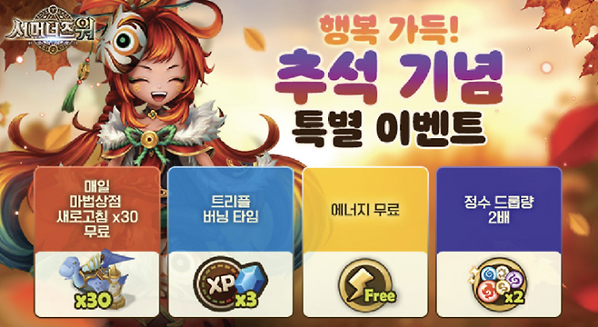 '서머너즈 워: 천공의 아레나'는 오는 10월 3일부터 12일까지 '행복 가득! 추석 기념 특별 이벤트'를 진행한다. 기간 동안 지정 콘텐츠 플레이 시 경험치와 마나석이 최대 3배 지급된다. 주말에는 특정 시간대에 시나리오, 던전 등에서 에너지 소모 없이 플레이할 수 있다. 또 오는 6일부터 10일까지는 카이로스 던전과 속성별 던전에서 정수를 2배로 획득할 수 있다.
