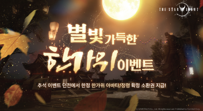신작 MMORPG '더 스타라이트'에서는 출석 보상과 한가위 이벤트 미션, 이벤트 던전 '풍요의 평원'을 포함한 특별 이벤트가 열린다. 접속만 해도 희귀 무기와 방어구 제작서 조각을 받을 수 있다. 미션 수행 시 '한가위 보름달 조각'을 획득할 수 있다. 던전에서 모은 '별빛 낙엽'으로는 한정 한가위 아바타, 정령 확정 소환권, 모험의 주문서 상자, 세공석, 강화석 등을 제작할 수 있다.