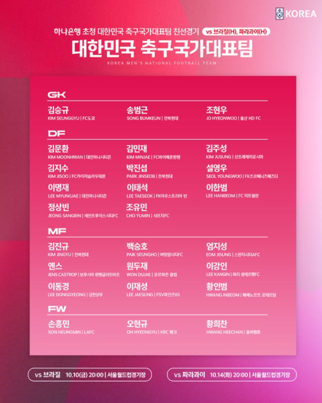 측면 공격수 출신인 손흥민과 황희찬은 물론 오현규도 스트라이커이기는 하나 최전방에서 상대 수비와 싸우는 것보다 저돌적인 움직임과 결정력, 그리고 수비 가담이 장점으로 꼽히는 공격수로 평가받는다. 홍 감독은 주민규, 오세훈, 이호재 등을 대신해 세 선수로 브라질, 파라과이와의 10월 A매치 2연전을 치르겠다는 의사를 간적접으로 내비친 셈이다.