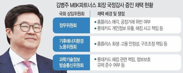 홈플러스 회생과 롯데카드 개인정보 유출 사태까지 겹치며 김병주 MBK 회장은 정치권의 집중포화를 피하기 어려운 상황이다.