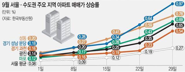 9월 첫째주부터 서울 아파트 매매가 상승률은 0.08%→0.09%→0.12%→0.19%→0.27%로 매주 오름폭을 키웠다.