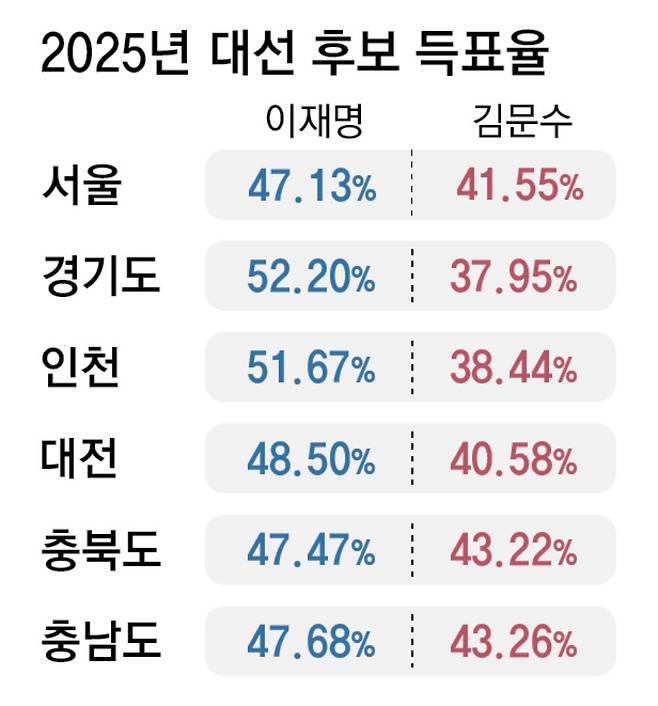 하지만 부동산 가격 상승 등으로 서울 표심이 보수화되고 있다는 분석이 나오면서 민주당은 긴장하고 있는 분위기다. 2022년 지방선거에선 송영길 후보가 오 시장에게 19.82%포인트, 2021년 재보궐 선거 때는 박영선 후보가 오 시장에게 18.32%포인트 차로 졌다. 지난 대선에서도 이 대통령의 득표율(47.13%)은 국민의힘 김 후보(41.55%)와 개혁신당 이준석 후보(9.94%)를 합친 것보다 적었다.