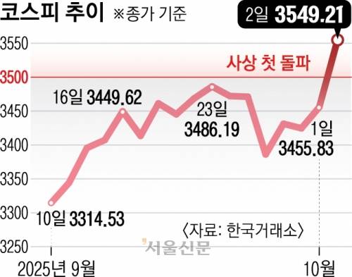 추석 연휴를 하루 앞두고 코스피가 3540선까지 치솟았다. 지난 9월 초 사상 처음으로 3300선을 돌파한 지 한 달도 안 돼 240포인트 이상 급등하는 등 불을 뿜었다. 이날 한때 상승률만 3%를 넘어갔다. 삼성전자는 장중 ‘9만전자’, SK하이닉스는 ‘40만닉스’에 올라서며 사상 최고가 행진을 주도했다.