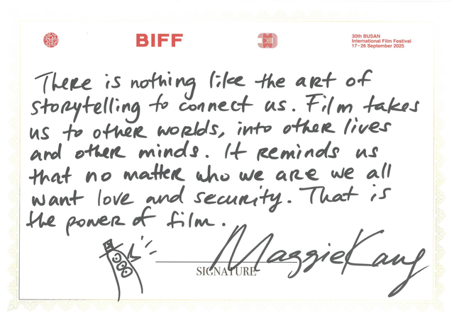 매기 강 | “이야기의 예술만큼 서로를 이어주는 건 없다. 영화는 우리를 다른 세계와 다른 삶, 그리고 다른 마음으로 이끌며, 결국 누구나 사랑과 안정감을 원한다는 것을 상기시킨다. 이것이 영화의 힘이다.”