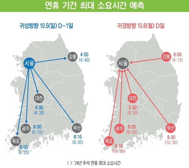 주요 도시 간 최대 소요시간 구간의 경우 귀성은 5일, 귀경은 6일 등으로 나타났고 귀성 방향은 지난해보다 소요 시간이 다소 증가하나 귀경 방향은 긴 귀경 기간(최대 7일)으로 감소할 것으로 예상됐다. 서울→부산 8시간10분, 서울→목포 6시간50분, 서울→대전 4시간30분, 서울→광주 6시간30분 등으로 전망됐다.