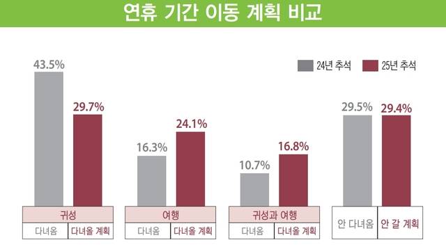 조사 결과 이번 추석 연휴 기간 총 이동 인원은 3천218만명이고 하루 평균 이동 인원은 775만명으로 전망됐다. 하루 평균 이동 인원은 지난해 추석 791만명에 비해 2% 감소했으며 응답자 중 70.6%는 귀성 또는 여행을 다녀올 계획이라고 밝혔다.