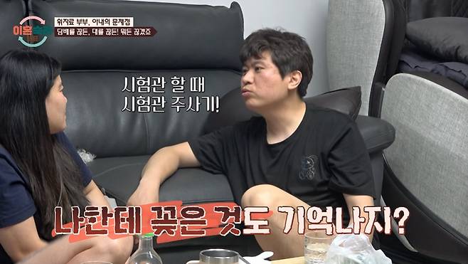 이에 아내는 "꽂으려고 했지 안 꽂았어"라고 반박했지만 남편이 "찔렸다"고 다시 이야기하자 아내는 "한 번 찔렸다고 치자. 그 한 번 찔리는 것도 싫냐?"라고 윽박질렀다.