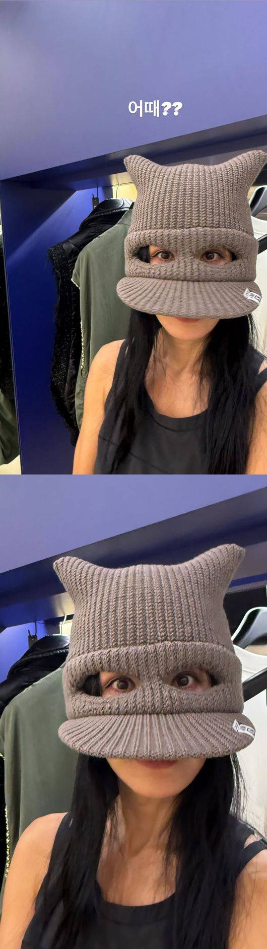 공개된 사진은 특이한 디자인의 모자를 쓴 엄정화의 모습. 엄정화가 착용한 모자는 니트 소재로 짜여진 디자인으로, 일반적인 모자와는 확연히 다른 형태를 자랑했다.