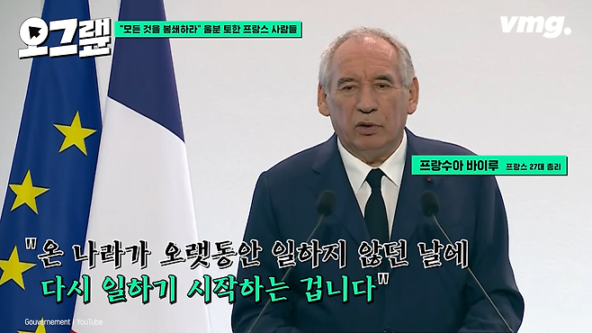 이들을 이렇게 분노케 한 이유, 바로 내년도 예산안 때문이었어요. 지난 7월 프랑스의 바이루 총리가 2026년 예산안을 발표합니다. 이 예산안에는 프랑스 재정적자를 낮추기 위해 공공지출 규모를 줄이고, 연금과 복지 혜택은 동결하는 안이 담겼어요. 또 세입을 확대하는 차원에서 공휴일 이틀을 줄이는 방안도 포함되어 있었죠. 이를테면 이제는 더 이상 의미가 희미해진 2차 세계대전 승리를 기념하는 전승기념일이나 부활절은 폐지해도 될 것 같다는 거죠.
