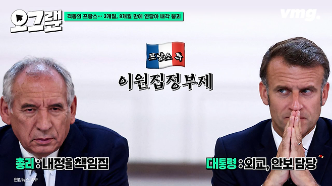 프랑스는 대통령이 외교와 안보를 담당하고 총리가 내정을 책임지는 이원집정부제입니다. 대통령은 총리를 임명할 수 있지만 의회는 헌법에 따라 총리와 내각에 책임을 물을 수 있죠.
