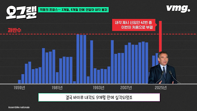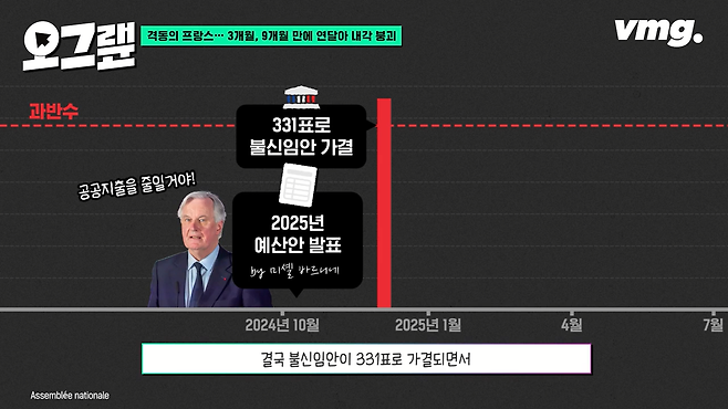 바이루 총리 이전 총리였던 미셸 바르니에 총리가 지난해 10월에 2025년 예산안을 발표했어요. 내년도 예산안과 마찬가지로 재정 건전성을 확보하기 위해 공공지출을 줄이겠다는 내용이 담겼죠. 이 예산안을 두고 의회는 강하게 반발했고 결국 불신임안이 331표로 가결되면서 임기를 시작한 지 3개월 만에 실각하게 됩니다. 이 기록은 프랑스 최단기 기록이자, 1962년 이래로 무려 62년 만의 불신임안 가결이었습니다.