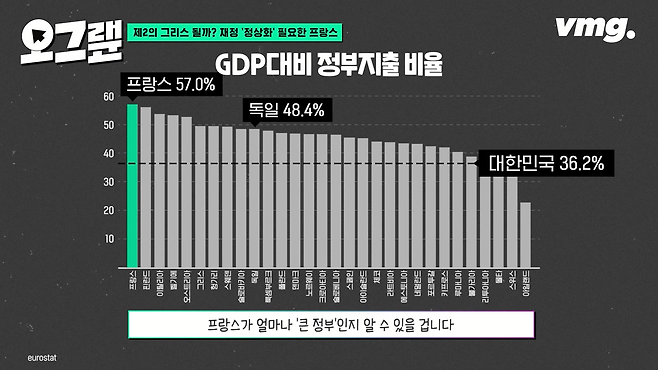 2023년 기준으로 프랑스는 다른 유로존 국가들 중에 가장 GDP 대비 정부 지출 비율이 높습니다. 무려 57.0%로 독일과 비교하면 거의 10%p 가까이 차이가 나죠. 참고로 우리나라가 2022년 기준으로 GDP 대비 36.2%를 지출하고 있으니 프랑스가 얼마나 '큰 정부'인지 알 수 있을 겁니다.
