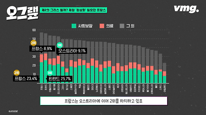 사회보장 지출만 보면 이렇게 나옵니다. 핀란드가 25.7%로 1위고, 프랑스가 23.4%로 2위입니다. 뿐만 아니라 의료 영역에서도 프랑스는 오스트리아에 이어 2위를 차지하고 있죠.