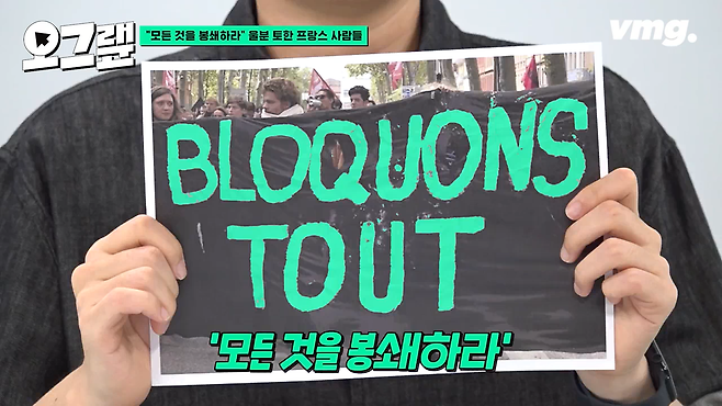 '블로꽁 뚜' 영어로 하면 'Block Everything'으로 '모든 것을 봉쇄하라'라는 뜻을 가진 문장입니다. 노동조합이나 특정 정치 단체에서 주도한 게 아니라 일반 시민들이 자발적으로 SNS에서 시작한 일종의 풀뿌리 운동이었죠. '블로꽁 뚜'를 달던 사람들은 9월 10일에 모이자는 해시태그를 달면서 조금 더 운동을 구체화시켰고 이 흐름은 전국적으로 확산되었어요. 9월 10일에 프랑스 시민들이 모여 말 그대로 프랑스의 모든 것을 봉쇄하자는 거였죠. 이날 경찰 추산으로는 프랑스 전국에서 800건이 넘는 시위와 봉쇄가 발생했고, 참여한 인원은 약 20만 명 규모였습니다.