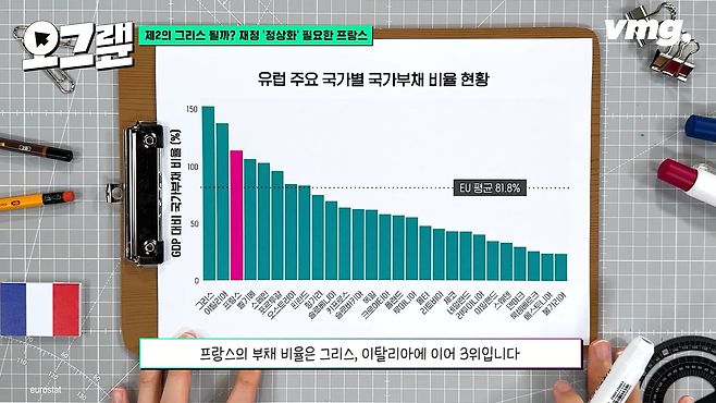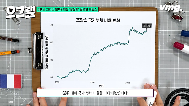 이번엔 다른 유럽 국가들과 비교해 보겠습니다. 프랑스의 부채 비율은 그리스, 이탈리아에 이어 3위입니다. 프랑스는 과거 심각한 재정 위기를 겪은 그리스, 이탈리아와 같은 그룹에 위치해 있어요. 문제는 그리스나 이탈리아는 점점 재정 상태가 개선되고 있는 반면에 프랑스는 그 기미가 보이질 않는다는 거죠.