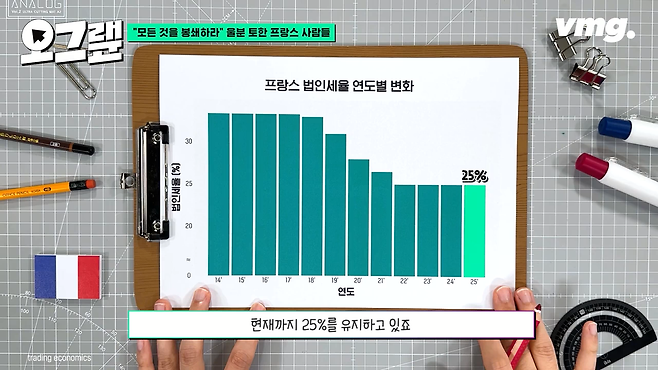 마크롱 대통령이 2017년 5월부터 임기가 시작됐는데, 2017년 33.3%였던 법인세가 2018년 33.0%로 줄어듭니다. 그리고 2022년까지 매년 감소해, 현재까지 25%를 유지하고 있습니다.