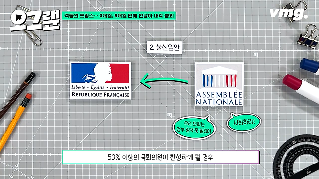 두 번째는 의회에서 정부의 정책 방향이나 특정 법안에 대해 책임을 묻는 표결을 하는 겁니다. 국회의원들이 지금 내각을 믿을 수 없다는 안을 제출하고 50% 이상의 국회의원이 찬성하게 될 경우 총리는 대통령에게 사퇴서를 제출해야 합니다. 의회는 정부가 주도하는 법안에 대해서도 불신임안을 낼 수 있어요.
