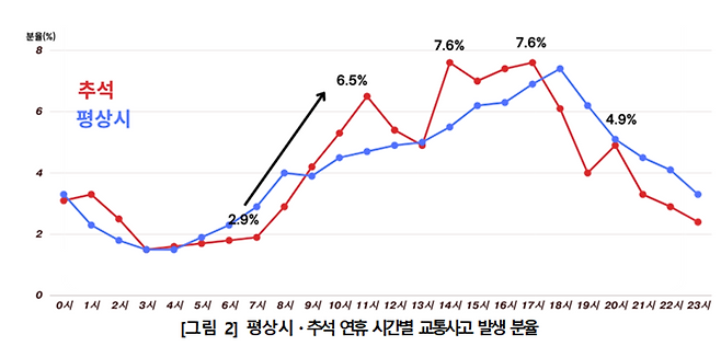 추석 연휴 중 사고가 가장 많이 발생하는 시간은 오후 2시와 5시(각 7.6%), 이어 오전 10시 전후로 사고율이 급증하는 것으로 나타났다. 사고 발생 이후 오후 6시 이후부터는 사고 비율이 점차 낮아졌다.
