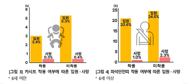 교통사고 피해의 심각도는 보호장비 착용 여부에 따라 뚜렷한 차이를 보였다. 카시트 미착용 시 입원율은 5.3%, 사망률은 0.4%로, 착용 시(입원 3.4%, 사망 0.3%)보다 모두 높았다.