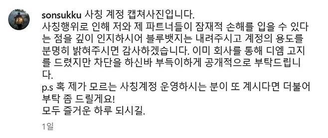 그는 "사칭 행위로 인해 저와 제 파트너들이 잠재적 손해를 입을 수 있다는 점을 깊이 인지해달라"며 "블루 배지를 내려주고 계정의 용도를 분명히 밝혀주시면 감사하겠다"고 강조했다.