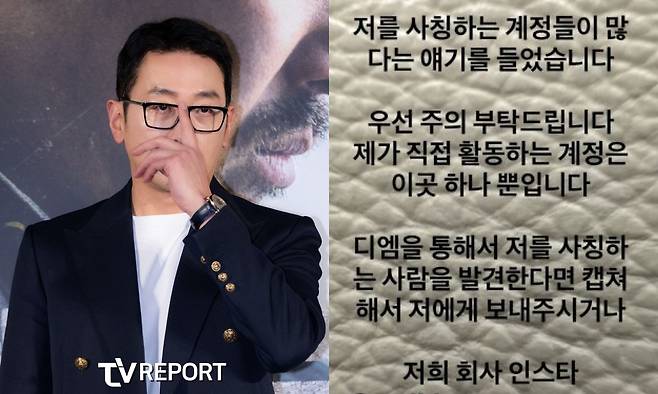 앞서 배우 하정우도 주의를 당부했다. 그는 지난 9월 15일 자신의 계정에 "저를 사칭하는 계정이 많다는 얘기를 들었다"며 "제가 직접 활동하는 계정은 이곳 하나뿐"이라고 밝혔다. 이어 "저를 사칭하는 사람을 발견하면 디엠을 통해 제게 알려주시거나 회사 계정에 제보해달라"고 당부했다.