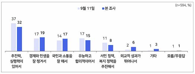 이 대통령의 국정운영에 대해 긍정평가를 한 응답자 중 32%가 그 이유로 '추진력과 실행력'을 꼽았고, '경제·민생을 잘 챙긴다' 19%, '소통을 잘한다' 17%, '유능·합리적이다' 15% 등의 답변이 뒤를 이었습니다.
