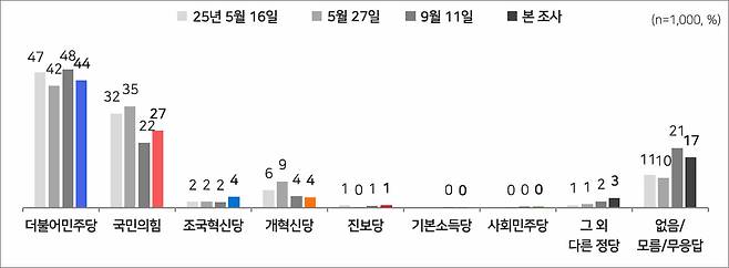 정당지지도는 더불어민주당이 44%로 가장 높았고, 국민의힘 27%, 조국혁신당과 개혁신당이 각각 4%로 집계됐습니다.