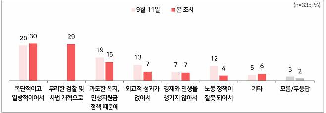 반면 부정평가 이유로는, 이 대통령이 '독단적이고 일방적'이라고 응답한 비율이 30%로 가장 높았고, '무리한 검찰·사법개혁 추진' 29%, '과도한 복지 정책' 15% 순으로 나타났습니다.