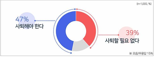 정치 개입 논란을 일으킨 조희대 대법원장에 대해 '사퇴해야 한다'는 응답은 47%로, 반대 의견 39%보다 높았고, 검찰청 해체에 대해선 '지지한다' 48%, '지지하지 않는다' 46%로 팽팽하게 갈렸습니다.