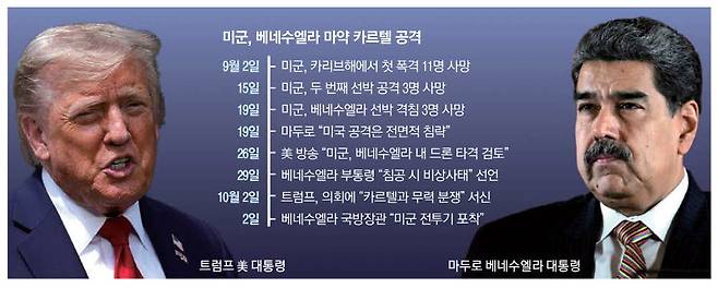 도널드 트럼프 미국 대통령이 베네수엘라 마약 카르텔과 '무력 분쟁'에 들어갔다고 선언했다. 지난달 카리브해에서 미군이 베네수엘라 선박을 세 차례 폭격해 17명이 숨지자 국제법 위반 논란이 일었고 트럼프 대통령은 이를 정당화하기 위해 전시 권한을 내세웠다. 이번 조치로 미국의 '마약과의 전쟁'이 실제 군사 충돌로 번지면서 국제사회 긴장이 고조되고 있다.