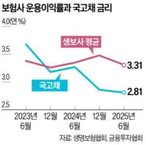 문제는 국내 보험업권의 자산 운용 역량이 크게 떨어진다는 점이다. 생명보험협회에 따르면 국내 22개 생보사의 올해 6월 말 운용자산이익률은 3.31%에 그쳤다. 같은 시기 10년 만기 국고채 금리(연 2.81%)를 간신히 웃돌았다. 시장금리가 높던 2023년에는 국고채 금리가 보험사 운용자산이익률을 넘어서기도 했다.