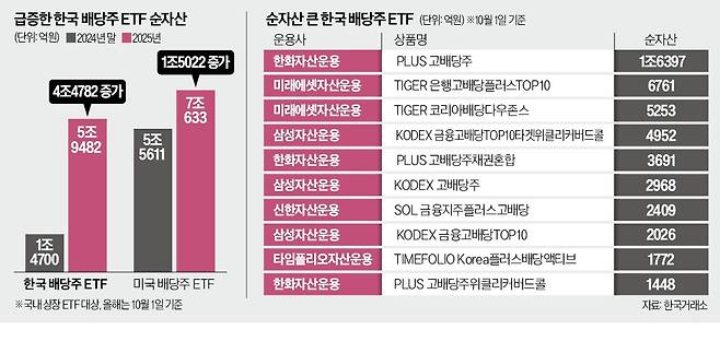 ‘배당주 투자는 미국’이라는 공식이 바뀌고 있다. 이재명 정부의 강력한 주주환원 정책으로 한국 배당주에 투자하는 상장지수펀드(ETF)에 뭉칫돈이 몰리고 있어서다. 이르면 올해 한국 배당주 ETF 규모가 국내 상장된 미국 배당 ETF를 추월할 것이라는 관측이 나온다.