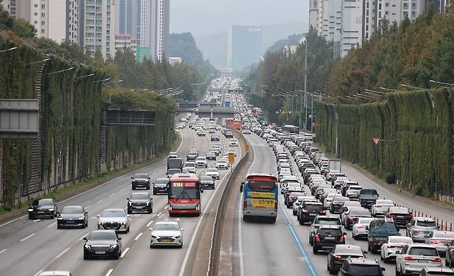 [추석 연휴 첫날인 3일 경부고속도로 서울 잠원나들목 인근 하행선이 정체를 빚고 있다. (사진=연합뉴스)]