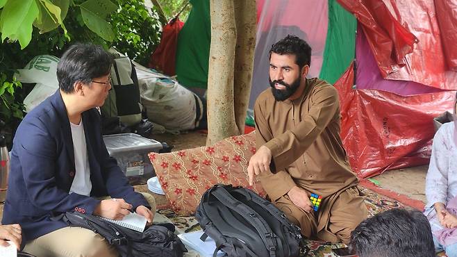 | ▲ 파이즈 박사와 아디 이동화 활동가 사단법인 아디 이동화 활동가에게 공원내 아프간 난민의 상황을 설명하고 있는 파이즈 박사 |