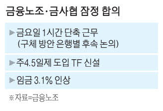 한편 이날 금융노조와 사측은 산별중앙교섭을 진행해 금요일 1시간 단축 근무 시행 외에도 주4.5일제 도입 TF 신설과 임금 3.1% 인상에 합의했다는 내용도 발표했다.