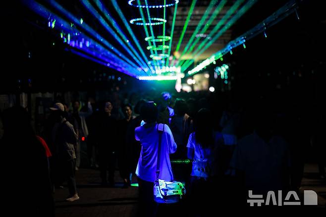 [서울=뉴시스] 정병혁 기자 = 3일 서울 광진구 뚝섬한강공원에서 열린 2025 서울라이트 한강 빛섬축제를 찾은 시민들이 라이트 전시를 살펴보고 있다. 2025.10.03. jhope@newsis.com