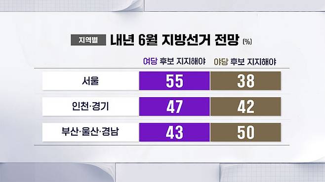 인천·경기는 여당 지지 47%, 야당 지지 42%, 부산·울산·경남은 여당 지지 43%, 야당 지지 50%로 오차 범위 안에 있었습니다.