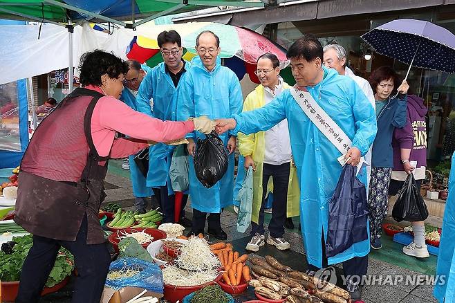 (동해=연합뉴스) 심규언 시장을 비롯한 강원 동해시 직원들이 3일 북평 민속장에서 추석맞이 전통시장 장보기 행사를 하고 있다. 2025.10.3 [동해시 제공. 재판매 및 DB 금지]