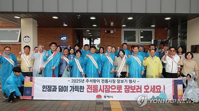 (동해=연합뉴스) 심규언 시장을 비롯한 강원 동해시 직원들이 3일 북평 민속장에서 추석맞이 전통시장 장보기 행사를 하며 기념 촬영하고 있다. 2025.10.3 [동해시 제공. 재판매 및 DB 금지]