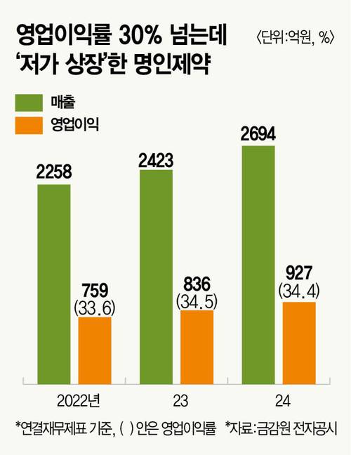 증권 업계 관계자는 “명인제약 최근 3년 평균 영업이익률이 30%를 훌쩍 넘는다”며 “재무건전성도 우량한 편인데 멀티플은 상당히 낮았던 게 사실”이라고 말했다. 할인율도 상당 수준으로 적용했다. 당초 주당 평가액은 8만5500원이었다. 여기에 최대 47.4% 할인율을 적용해 희망 공모가 범위 하단을 4만5000원으로 낮췄다. 상단에도 32.2% 할인율이 적용돼 5만8000원이 됐다. 2022년 이후 상장 기업 평균 할인율(19.9%~32.8%)을 크게 웃도는 수준이다. 최종 공모가는 범위 상단인 5만8000원으로 정해졌다.