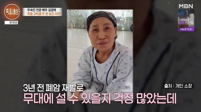 이날 무속인 전문 배우 김경애가 전주 패션쇼 행사장에 도착, 화려한 의상으로 갈아입고 무대에 올랐다. 6년 전 트로트 가수로 데뷔한 김경애는 노래를 선보였다. 김경애는 인터뷰에서 "사경을 헤맨 적 있다. 폐암 1기가 나왔다. 놀라서 난리가 났다"라며 "폐암 1기니까 조그만 것만 딱 제거하고 5년 되면 다 낫는다 그랬다. 그런데 4년 7개월 만에 또 나타나서 기절초풍했다. 두 번 수술하고 이렇게 살아있다. 기적 아니냐"라고 털어놓았다. 73세에 폐암 1기로 수술을 받은 김경애는 3년 전 폐암 재발로 힘든 시기를 보냈다고.