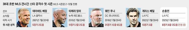 이들은 손흥민처럼 유럽 시즌이 끝난 여름, 2월부터 12월까지 이어지는 MLS 시즌 도중에 합류했는데 루니가 21경기 12골 6도움으로 체면치레를 한 반면 베컴(5경기 2도움)과 앙리(11경기 2골 2도움), 베일(13경기 3골)은 첫 시즌 성적이 모두 기대에 미치지 못했다. 경기당 1골씩 넣으며 빠르게 적응하는 손흥민의 활약이 더욱 돋보이는 이유다.
