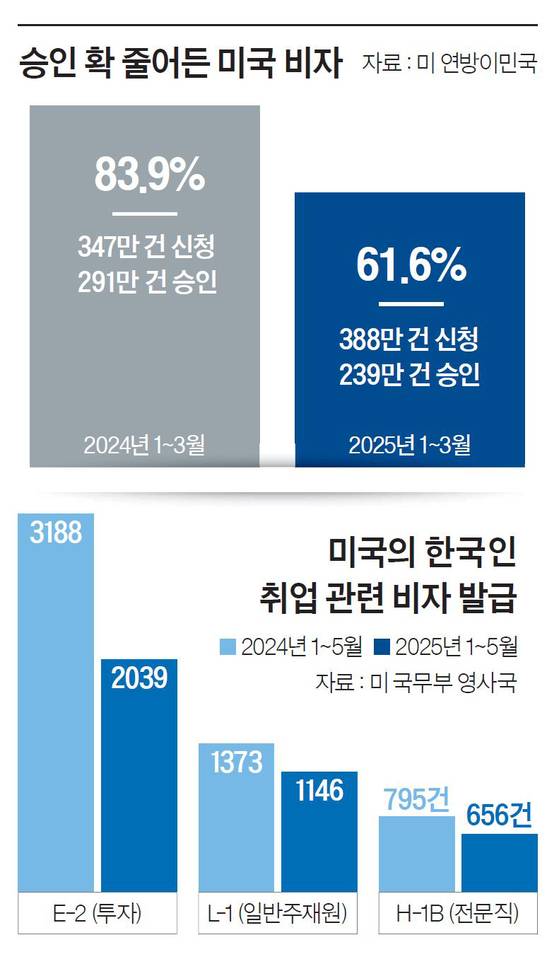 특히 무비자 전자여행허가(ESTA) 체류 기간의 두 배인 6개월을 머물 수 있는 B-1/B-2는 37%나 빠졌다. B-1/B-2 비자는 ESTA와 함께 조지아에서 체포된 한국인 근로자들이 많이 소지하고 있었다. 국내의 한 비자 전문가는 “미국의 B-1/B-2 발급이 한국인 근로자 체포 전부터 현저히 줄어든 건 일종의 전조 현상으로 봐도 무리가 없어 보인다”며 “현장과 비자 목적이 일치하지 않은 관행을 눈여겨보고 있었을 것”이라고 말했다.