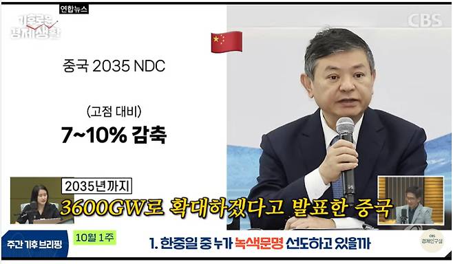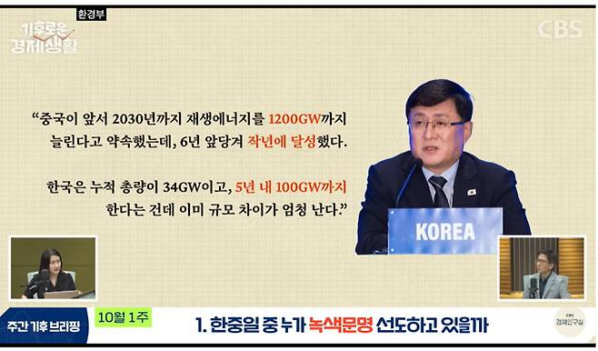 ◇ 최서윤> 안 그래도 김성환 장관한테 질문할 기회가 있어서 재생에너지 관련해서 중국이랑 협력할 만한 게 있냐고 했더니 협력이라는 단어를 사용하기에는 중국이 지금 스케일이 너무 커서 위기감이 든다고 하시더라고요.