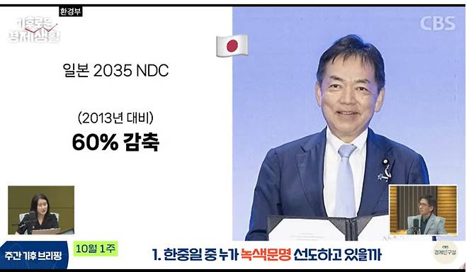 ◇ 최서윤> 네. 일본입니다. 우선 일본 기후 정책 가운데 지금 최대 현안이 하나 있어요. 내년부터 배출권 거래제(ETS)를 시행하거든요. 의무화하는 거예요. 우리나라가 2015년에 시작했기 때문에 우리보다 한 11년 정도 늦게 시작하는 거긴 합니다. 대신에 일본은 전환 금융 같은 다른 정책을 더 먼저 시작했어요. 그래서 일본의 기후 정책은 딱 들었을 때 중국하고 다르게 전반적으로 되게 야심찬 목표를 제시하기보다는 속도를 조절하면서 진행하고 있다는 분석이 많아요. 그런데 대신에 그걸 지켜가고 있다는 분석이 많은데요. NDC 같은 경우에 일본이 약속을 지켰어요. 올해 2월에 2035 NDC를 이미 제출했어요. 정점이 2013년인데 2013년 대비 60% 정도 감축하겠다고 목표를 세웠어요.