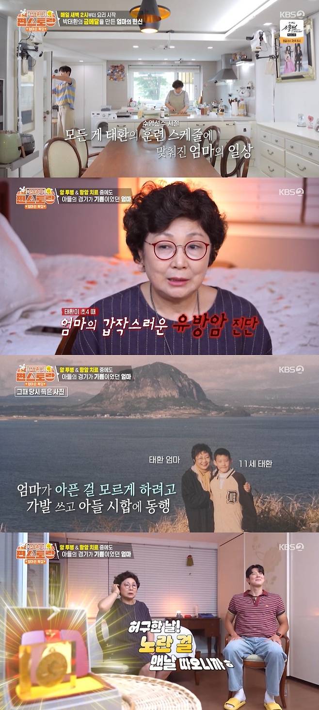 무리한 스케줄 탓에 어머니는 박태환이 초등학교 4학년이던 99년 유방암 초기 진단을 받았다. 어머니는 "초기라서 빨리 수술하면 되는데 태환이 시합이 있었다. 보름 정도 지났더니 1기로 진행됐다. 항암 치료하면서 머리도 싹 밀고 가발 쓴 상태로 전국체전 보러 갔다"고 말해 놀라움을 안겼다.