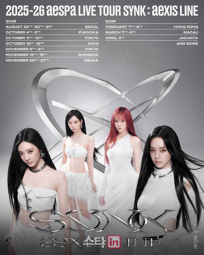 에스파는 지난달 25일부터 내년 2월 7~8일 홍콩 아시아월드 아레나에서 개최하는 2025 라이브투어 '싱크 : 엑시스 라인'(SYNK : aeXIS LINE) 공연의 티켓 예매를 진행했다.