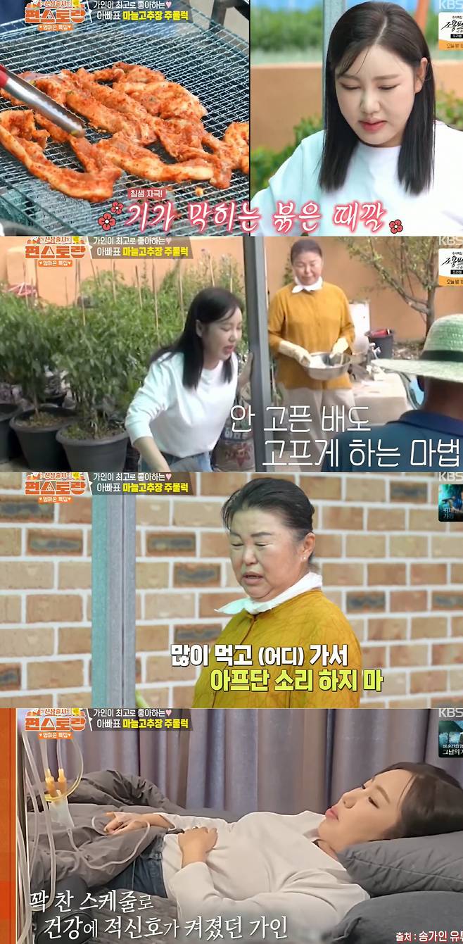 옆에서 이를 지켜보던 어머니는 "이게 보양식이다. 많이 먹고 어디 가서 아프단 소리 하지 마라"며 딸의 건강을 걱정했다. 앞서 지난 6월, 송가인은 과중한 스케줄로 인해 건강 이상을 겪고 응급실에 실려 가는 일이 있었고, 결국 생방송 무대까지 불참한 바 있다.