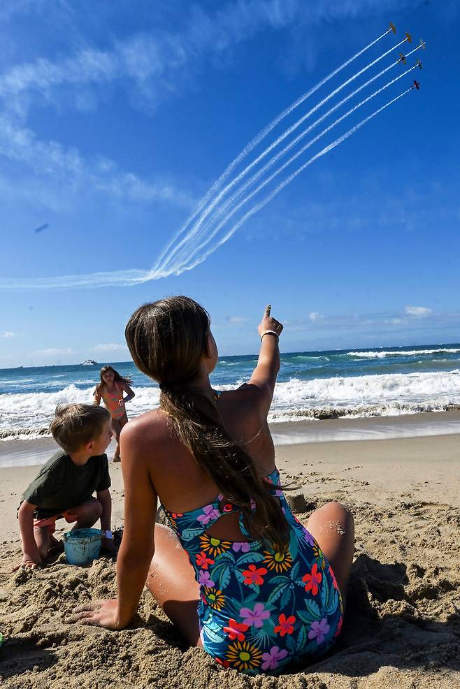 [헌팅턴비치=AP/뉴시스] 3일(현지 시간) 미 캘리포니아주 헌팅턴비치에서 물놀이를 즐기던 어린이들이 이날 열린 '퍼시픽 에어쇼'에서 곡예비행을 펼치는 돈 패트롤(Dawn Patrol) 팀을 바라보고 있다. 5일까지 열리는 이번 에어쇼에는 연방정부 셧다운으로 인해 미군 비행기는 불참한다. 2025.10.04.